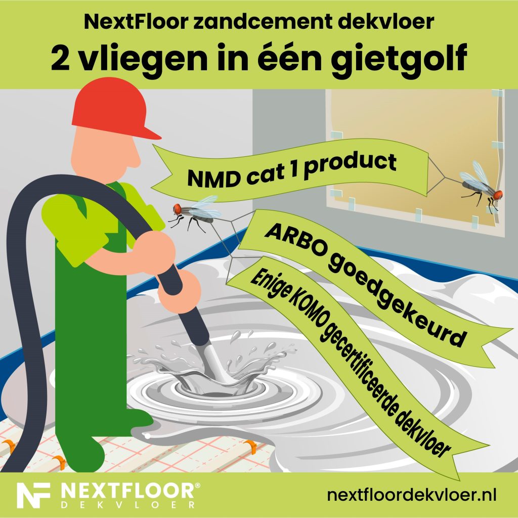NextFloor zandcement dekvloeren gietmortel is de eerste KOMO gecertificeerde dekvloerenmortel opgenomen in de NMD en waarvan de EPD beschikbaar is. 37% minder Co2 uitstoot tov een tarditioneel gesmeerder dekvloer.